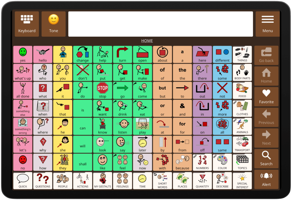 - Symbol-based AAC. Can be used across multiple devices, open source (many options for boards and very customizable), has the option for typing, and allows for tracking usage/gathering statistics for parents/professionals.